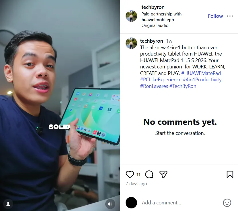 For young professional and content creator John Dy So, the long-lasting battery is a key creative enabler. From brainstorming content ideas and outlining scripts to editing drafts and reviewing footage, he can work continuously without worrying about running out of power. As a creative, he often works from cafés, co-working spaces, or while commuting, and the HUAWEI MatePad 11.5 S 2026 ensures his creativity and productivity never have to pause.