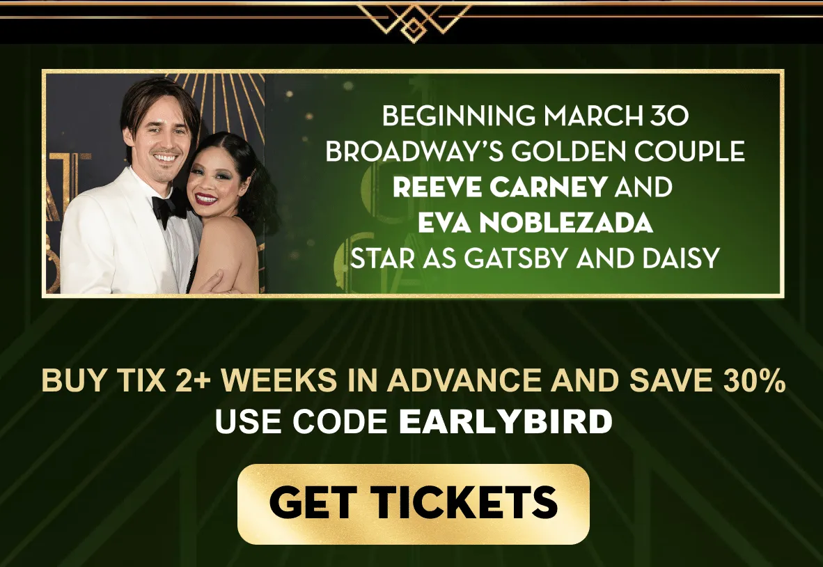 Then on March 30, Reeve Carney makes his debut as Gatsb y, playing opposite his wife, Eva Noblezada. The Great Gatsby will mark their first reunion on the Broadway stage since Hadestown, and their first time performing together on Broadway as husband and wife.